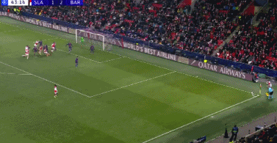 第34分钟,德容直塞,费尔明小角度抽射破门,巴萨1-1布拉格斯拉维亚